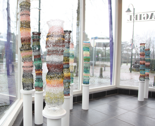 Vorig jaar -2023- wilde ik ze klaarmaken om weer te exposeren, tot mijn groot verdriet waren delen verpulverd. Niet al het gebruikte materiaal was duurzaam genoeg. Ik had me laten meevoeren door de mooie kleuren, een les bij experimenteel gebruik van gevonden recycle materiaal.
